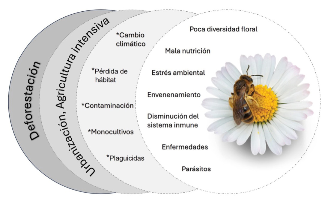 En la actualidad, las abejas enfrentan varios problemas que afectan su salud y supervivencia; dentro de los más significativos encontramos la deforestación causada por la urbanización y la agricultura intensiva. De la mano de estos, el uso de plaguicidas, especialmente los neonicotinoides, que tienen efectos perjudiciales sobre las abejas, afectando su capacidad de forrajeo, navegación, reproducción y supervivencia en general. Además, los monocultivos limitan la diversidad floral, afectando la dieta de las abejas y reduciendo su resistencia a enfermedades y estrés ambiental. Aunado a estos, los problemas globales como el cambio climático y la contaminación han jugado un papel importante en la sobrevivencia de estos insectos.