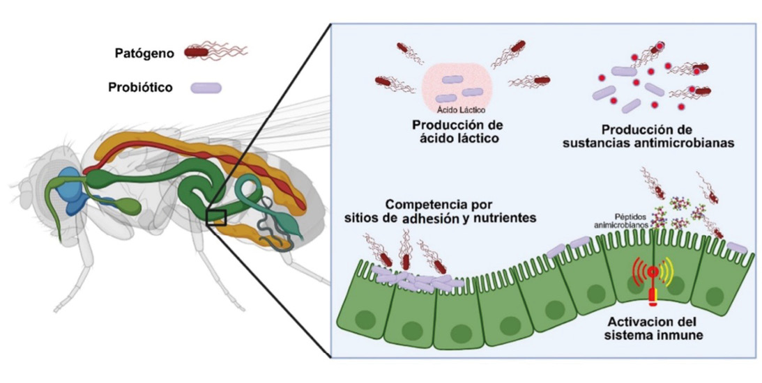 Según la FAO (Organización de las Naciones Unidas para la Alimentación y la Agricultura), los probióticos son «microorganismos vivos que, cuando se administran en cantidades adecuadas, confieren beneficios a la salud del huésped». Estos microorganismos ejercen su función al llegar vivos al intestino y colonizarlo, compitiendo por espacio y nutrientes, formando, primeramente, una barrera física que impide que se adhieran microorganismos patógenos. También, al colonizar el intestino, activan el sistema inmune de la abeja, produciendo péptidos antimicrobianos. Muchos de estos microorganismos producen sustancias como el ácido láctico que modifican el pH, haciendo al intestino inhabitable para los otros microorganismos; además, pueden secretar sustancias antimicrobianas que eliminan a los patógenos. Adicionalmente, algunos probióticos liberan enzimas que ayudan a metabolizar sustancias tóxicas.