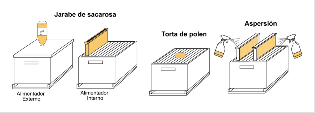 Por otro lado, las tortas de polen ofrecen un sistema adecuado para suministrar probióticos, puesto que adicionalmente aportan beneficios nutricionales que apoyan la salud general de la colonia. Sin embargo, una desventaja de ambos métodos es que solo las abejas adultas consumen directamente el producto, lo que significa que la distribución en la cámara de cría depende del flujo de nutrientes entre las abejas nodrizas y las larvas. Por ello, una alternativa es la aspersión o pulverización de probióticos en una solución salina tamponada con fosfato, ya que las células bacterianas permanecen viables incluso años; además, este método tiene el potencial de permitir una dispersión física del inóculo en toda una colmena.