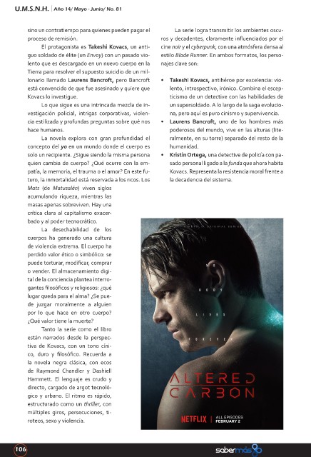 El protagonista es Takeshi Kovacs, un anti- cine noir y el cyberpunk, con una atmósfera densa al