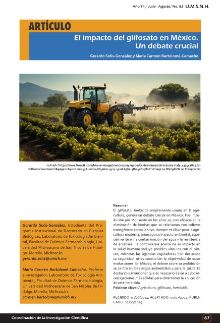 Universidad Michoacana de San Nicolás de Hi- Palabras clave: Agricultura, glifosato, herbicida.
