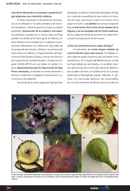higo; c) daños causados por las larvas en el receptáculo; d) larva abandonando el higo; e) orificio de salida de la larva. Fotografías de los