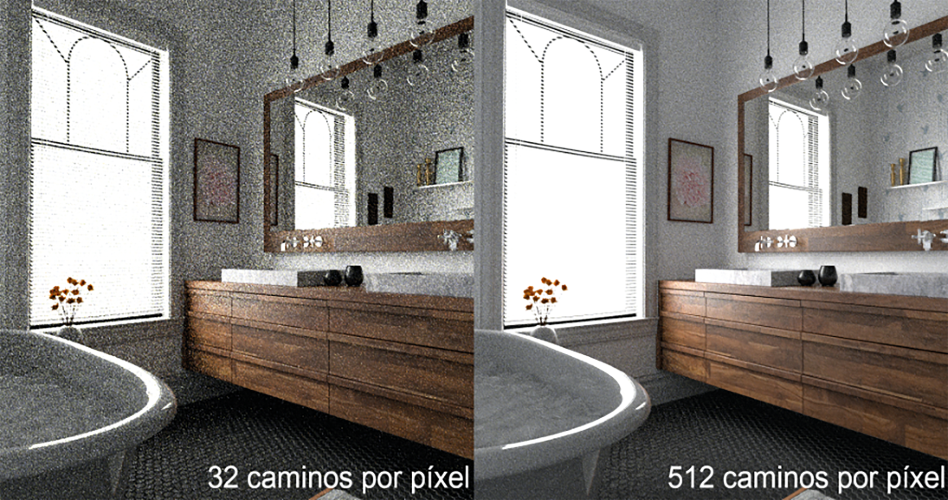 Consideren que están observando un paisaje. ¿Alguna vez se han preguntado por qué podemos observar este paisaje? La respuesta es muy compleja y su naturaleza depende del momento en el que enfoquemos la explicación. A nivel de nuestros ojos, podemos hablar de la retina y su sensibilidad para detectar diferencias en brillo y color, un proceso, en principio, similar al que se efectúa al tomar una fotografía. Pero vayamos un poco más atrás en el tiempo y pensemos en por qué vemos lo que vemos. Si cambiamos nuestra posición u observamos a una hora diferente del día, la imagen observada también cambiará. Para comprender mejor cómo es que este fenómeno funciona, pongámonos en un escenario muy simple. Consideren que se encuentran dentro de una habitación completamente cerrada y sin ventanas, pero con la luz encendida, y están observando una escena con objetos de diversos colores. Ahora imaginen que la luz se apaga. A pesar de que los objetos del cuarto aún se encuentran ahí, con exactamente las mismas propiedades que antes, tus ojos ya no serían capaces de percibirlos. Si después la luz es encendida, tus ojos podrían detectar de nuevo todos los objetos presentes en la escena. Este evento de encender la fuente de luz desencadena la emisión de millones de partículas llamadas fotones que interactúan con varios objetos presentes en la escena, rebotando una gran cantidad de veces entre ellos. Son los fotones rebotados que llegan a la retina humana los que finalmente dan lugar al sentido de la vista. Las interacciones y caminos recorridos por estos fotones proporcionan la información al ojo humano de todos los objetos que se encuentran en el campo visual. A lo largo de su recorrido, la luz sufre distintas interacciones como absorciones y dispersiones que generan los colores percibidos y, de manera global, las imágenes generadas por el cerebro. Las diferencias en color y brillo de la luz, que son inducidas por los objetos de la escena, contienen la información necesaria para determinar la posición, orientación, tamaño, color y perspectiva de los objetos acorde a la posición desde la que se observan. El transporte de luz, en sí mismo, engloba la naturaleza visual de la realidad, la cual es detectada por un sensor como la retina o la película de una cámara y, quizás, posteriormente, procesada por el cerebro humano o por una computadora. La generación de imágenes fotorrealistas consiste en la simulación por computadora tanto del transporte de luz como de su detección por un sensor. Esta simulación es extremadamente difícil desde un punto de vista teórico. Primeramente, se requiere de un conocimiento de las leyes físicas que modelan el transporte de luz, dadas principalmente por las ramas de la óptica y el electromagnetismo. En segunda, se necesita de una aplicación de matemáticas avanzadas para poder resolver este modelo físico. Y, en tercera instancia, una utilización eficiente de los recursos computacionales para que esta simulación sea factible en una computadora. Las imágenes generadas por computadora que simulan la realidad son usadas en diversos ámbitos: películas animadas, videojuegos, diseño asistido por computadora y realidad virtual. La generación de estas imágenes necesita un conjunto de datos de entrada, conocidos como escena, que, a grandes rasgos, están conformados por los valores de la cámara, la ubicación de las luces y los objetos presentes en la escena, cada uno con un material asociado que determina cómo interactúa la luz con estos objetos. Posteriormente, esta escena es procesada por una computadora mediante algoritmos que simulan el transporte de luz, generando una imagen final llamada render como lo que se representa en la siguiente figura. La simulación del transporte de luz es extremadamente costosa dado que millones de fotones están siendo emitidos. Cada una de estas partículas de luz emitidas interactúa y rebota con los objetos presentes en la escena, generando un camino de luz. Esto resulta en una infinidad de posibles caminos de luz que deben ser simulados por la computadora, una tarea titánica que no puede ser completada. Debido a esto, se recurre a una aproximación numérica de la solución exacta, la cual seguirá siendo extremadamente costosa, pero al menos es calculable. El método numérico usado para este fin es la integración Monte Carlo que, a muy grandes rasgos, consiste en la obtención aleatoria de algunos caminos de luz que serán utilizados para aproximar la solución, es decir, el render que se quiere calcular. Por ejemplo, se pueden obtener aleatoriamente 32 caminos por cada píxel de la imagen para estimar el valor del transporte de luz detectado en cada píxel. Este número de caminos aleatoriamente obtenidos puede ser incrementado para obtener una mejor solución, como te lo mostramos en la siguiente figura. Al algoritmo que obtiene aleatoriamente varios caminos de luz en todos los píxeles de la imagen que está siendo calculada, se le conoce como algoritmo path tracing o trazador de caminos. La velocidad con la que se obtiene una imagen (solución) de la simulación del transporte de luz depende de la manera en la que se obtuvieron los caminos aleatorios de luz. Se dice que esta generación de caminos es eficiente si es capaz de encontrar frecuentemente los caminos con mayor energía. Mientras más eficiente sea la selección aleatoria de los caminos de luz, más rápido se obtendrá la solución correcta. Un problema particularmente difícil es la existencia de caminos de luz altamente energéticos, pero sumamente difíciles de obtener aleatoriamente. La investigación de este problema consiste en desarrollar técnicas eficientes para obtener este tipo de caminos de luz, con la finalidad de generar (renderizar) imágenes fotorrealistas en un menor tiempo. Un ejemplo de obtención de caminos de luz de una manera distinta a la dada por el algoritmo path tracing es la exploración local de c