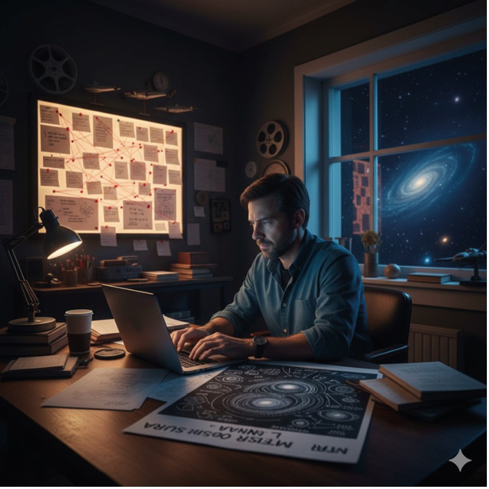 Pero no quiero que sea una película aburrida, toda oscura y muda. Se trataría de preguntar a quién se le ocurrió hacer el universo para preparar lo que vendría después: la gestación de la gran energía y la materia, como una madre que prepara el camino para las fuerzas que le darían forma, como la gravedad, el electromagnetismo y otras que todavía no comprendo del todo.